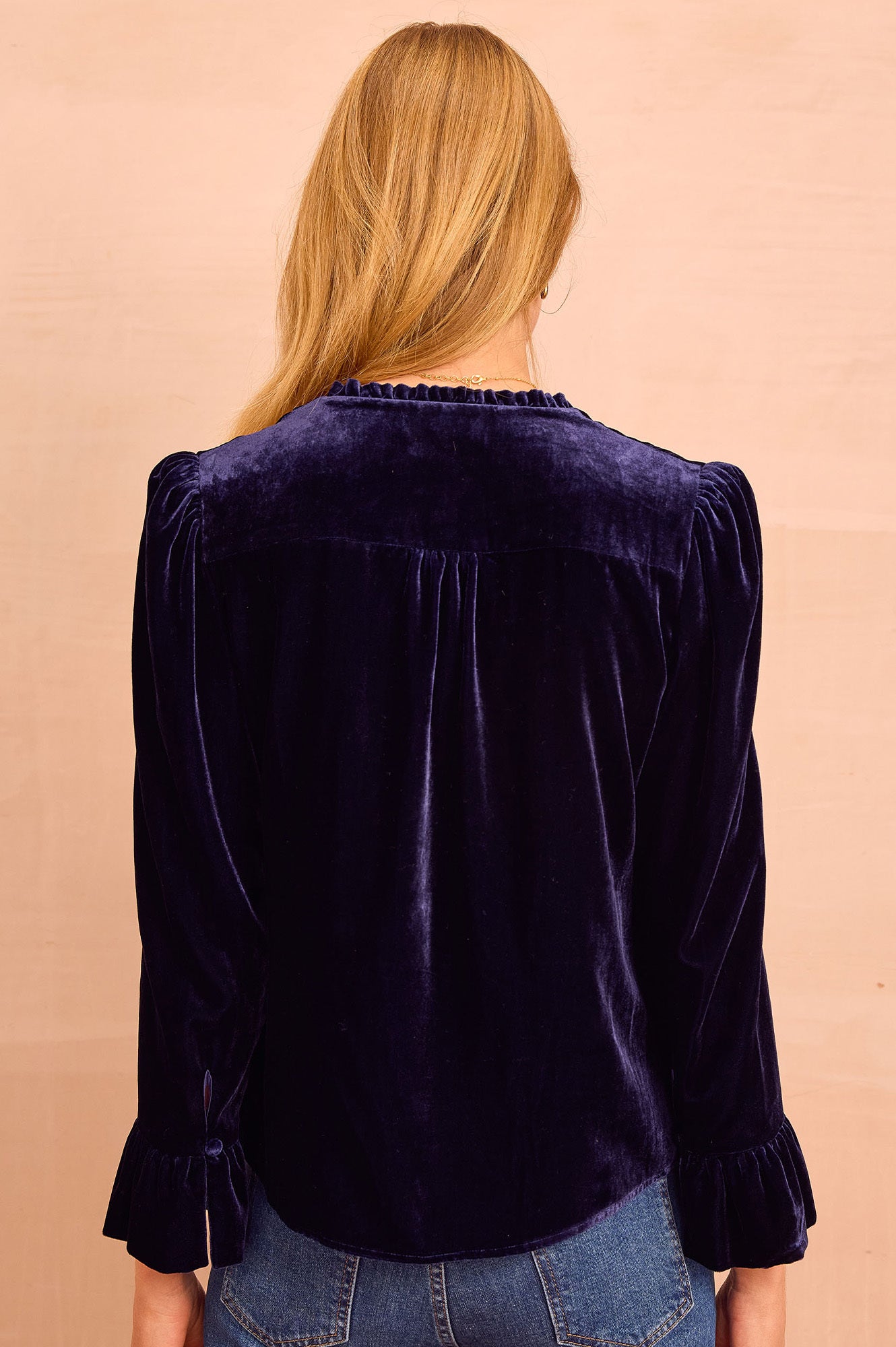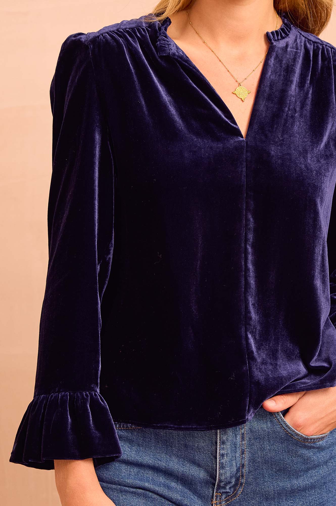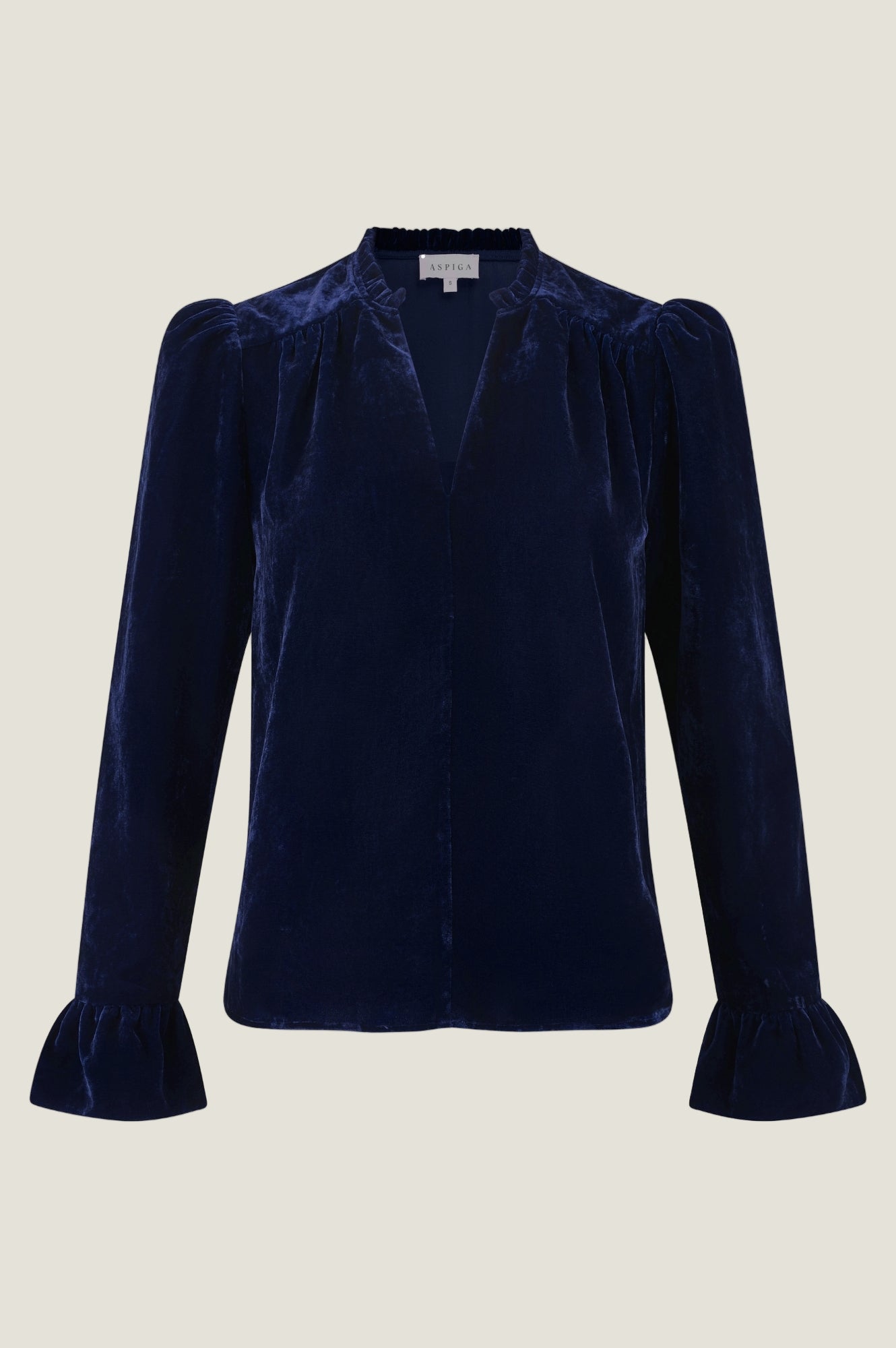 Inspired by the elegant Astrid Dress, the Astrid Top is crafted from luxurious viscose velvet. This blouse features a flattering V neckline, bracelet length fluted sleeves, and chic puff shoulders. Understated yet effortlessly sophisticated, it adds a subtle wow factor to any outfit, perfect for transitioning seamlessly from office hours to evening plans. This is a fitted style, for a looser silhouette, please size up